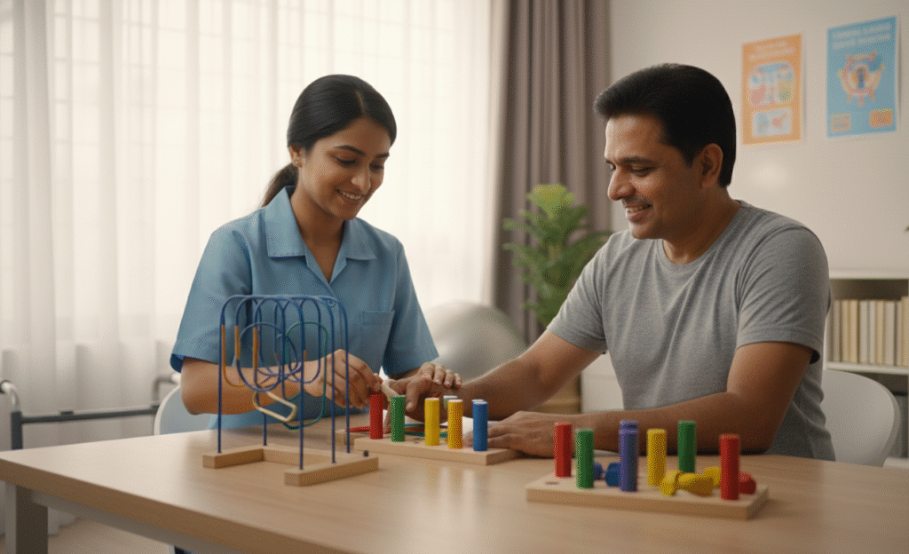 We provide Occupational Therapy at Home to help patients regain independence in daily activities, focusing on fine motor skills, coordination, and functional recovery.